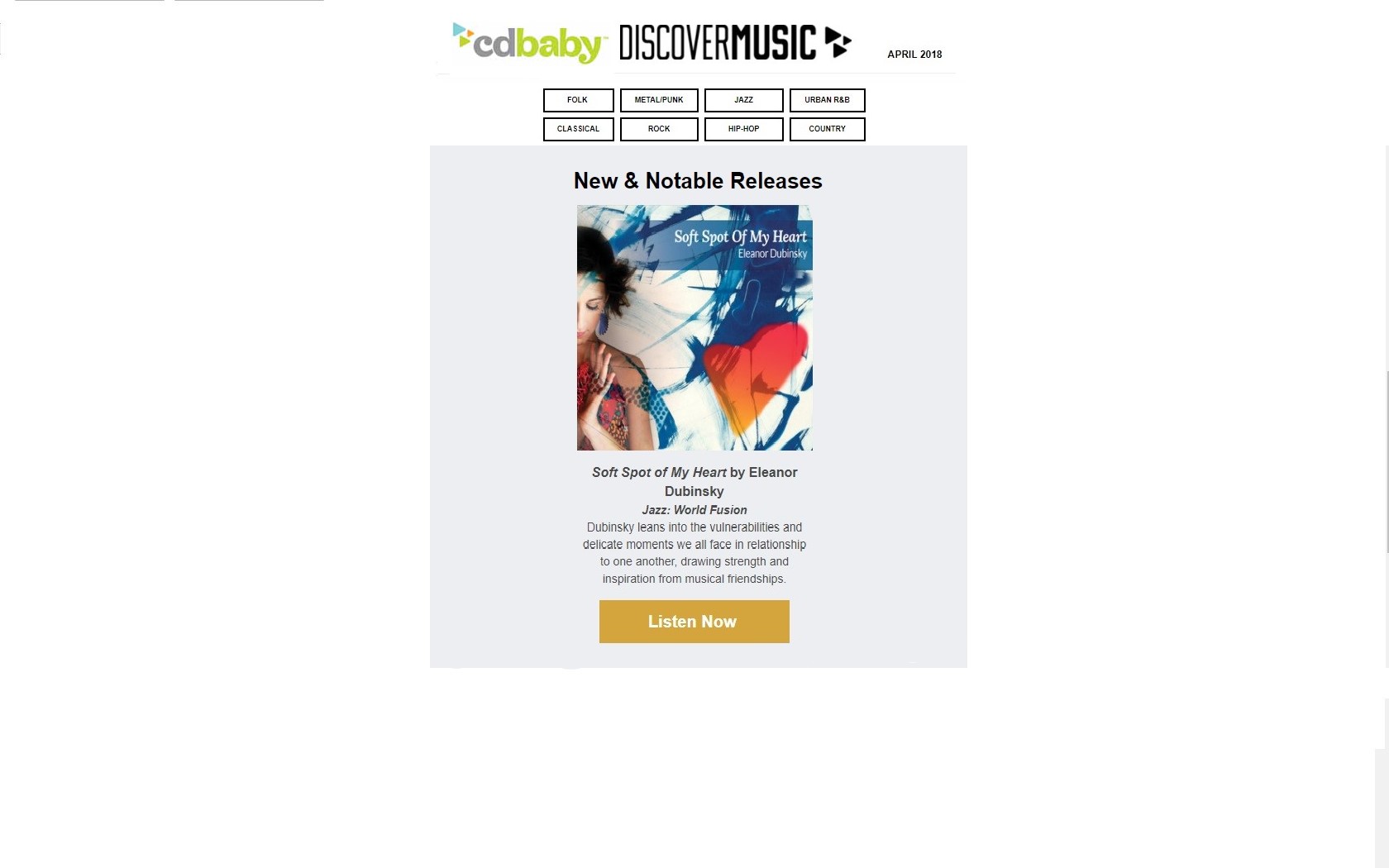 "Soft Spot Of My Heart is a cerebral, thought-provoking and enchanting album that has the capacity to captivate. It is full of melodic and memorable music which Eleanor Dubinsky delivers against a series of carefully crafted and polished arrangements...poignant, powerful and thought-provoking." - Derek's Music Blog